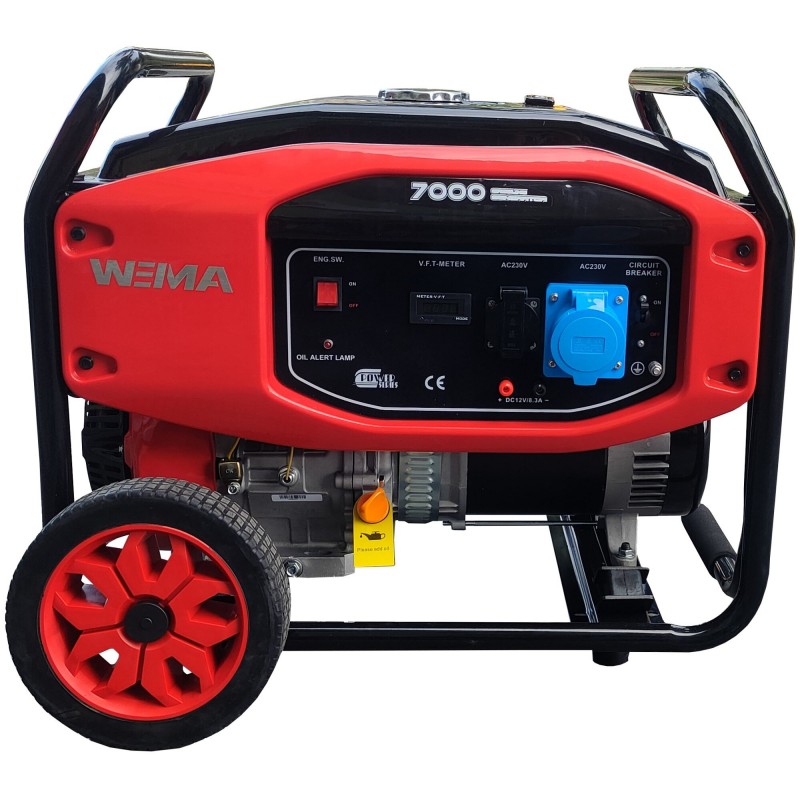 Agregat prądotwórczy WM7000 marki WEIMA to jednofazowy generator benzynowy wyposażony w silnik czterosuwowy, OHV o pojemności 420 cc i mocy maksymalnej 7 kW generujący napięcie 230 V i posiadający 2 gniazda jednofazowe oraz wyjście DC 12V/8.3A. Urządzenie posiada zbiornik o pojemności 25 litrów, który umożliwia ciągłą pracę przez 8 godzin.