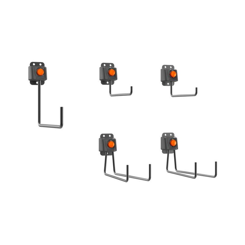 Ten zestaw 5 haków, będący dodatkiem do systemu przechowywania Aspire™, jest zoptymalizowany tak, aby pasował do pełnej gamy Husqvarna Aspire™, a także do najpopularniejszych narzędzi ogrodowych, takich jak narzędzia ręczne, węże do wody czy miotły. Każdy hak można przymocować do montowanej na ścianie szyny do przechowywania Aspire™ lub zainstalować bezpośrednio na ścianie – umożliwiając inteligentne i efektywne przechowywanie. Te pojedyncze i podwójne haczyki z najwyższej jakości materiału, dostępne w różnych rozmiarach, pozwalają wygodnie i schludnie uporządkować wszystkie narzędzia ogrodowe na ograniczonej przestrzeni.